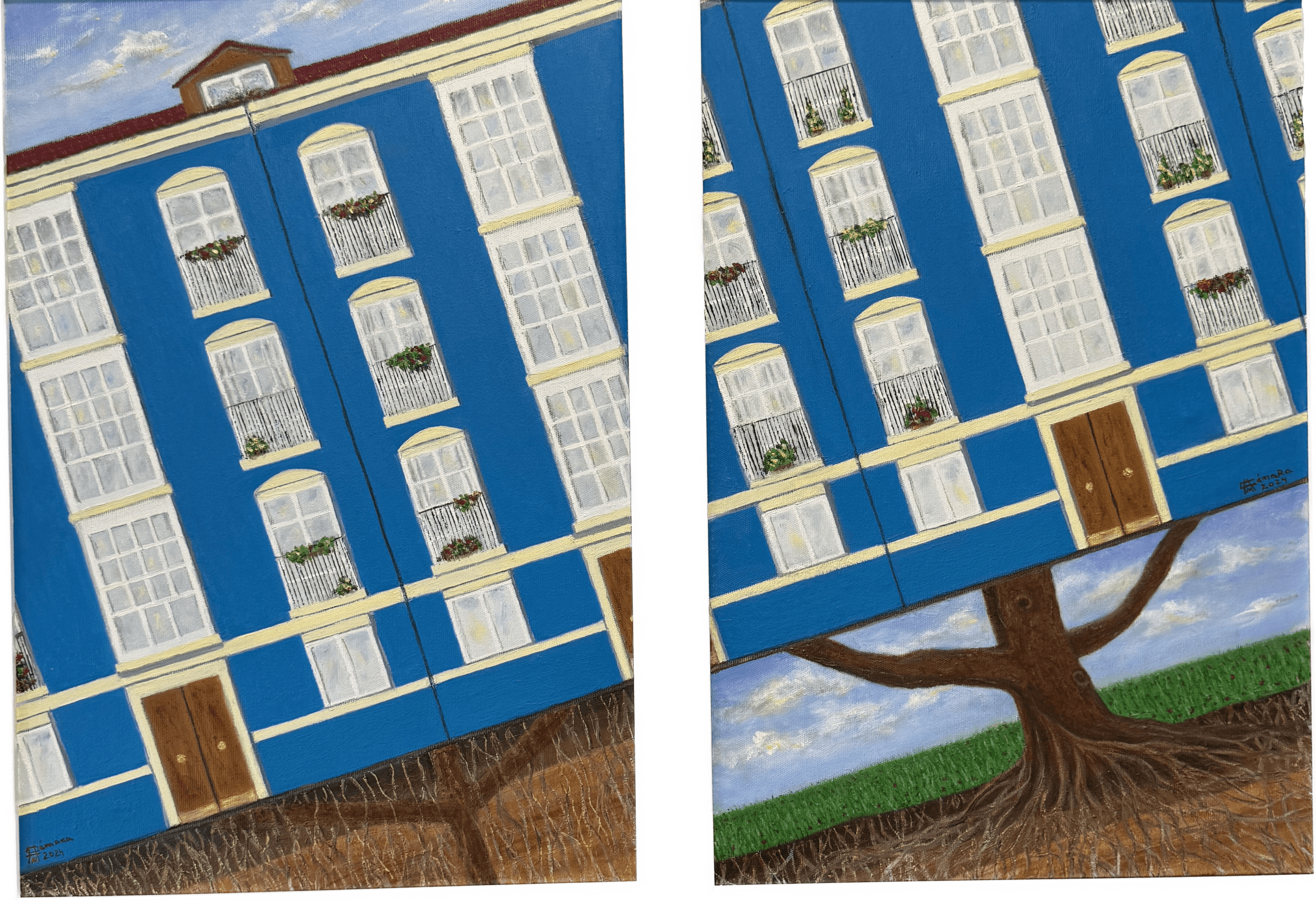 Juego con las formas. ¿Por qué no inclinar las figuras, los objetos, las formas? Encuentra la realidad que he proyectado, que aunque a veces esté disfrazada de formas geométricas, permanece ahí. La geometría también está en la naturaleza, es la esencia de los objetos, la estructura que los sostiene. Su esquema y su fuerza.
